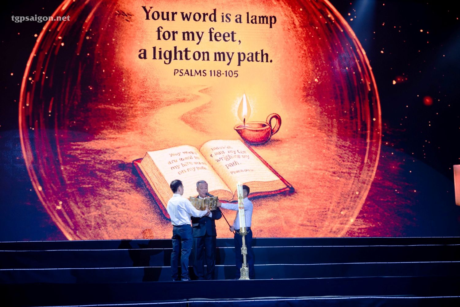 Lm Giuse Tạ Huy Hoàng đã công bố Lời Chúa (Ga 1, 1-14): “…Ngôi Lời đã làm Người và ở giữa chúng ta…”. Và những lời cầu nguyện được bốn vị đại diện, dâng lên Chúa lời tạ ơn những hồng ân Chúa ban, đồng thời cũng dâng lên Ngài những thất bại cay đắng, những đau khổ đẫm nước mắt của bao con người. Xin Chúa thắp lên trong tâm hồn mỗi người ngọn lửa Tình yêu, để chúng con biết cùng nhau lan tỏa ánh sáng ấy đến mọi nơi, reo rắc hy vọng cho mọi người.