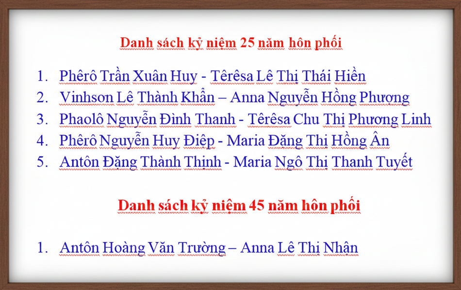 Thánh lễ tạ ơn mừng kỷ niệm 25 và 45 năm hôn phối khép lại trong bầu khí trang nghiêm, sốt sắng và đong đầy cảm xúc. Những ngọn nến sáng, những lời hứa được lặp lại và những chiếc nhẫn được trao hôm nay, như một lần nữa khẳng định tình yêu trung tín mà các đôi hôn phối đã gìn giữ suốt bao năm tháng. Ước mong rằng, với ơn Chúa nâng đỡ, các gia đình sẽ tiếp tục bước đi trong sự hiệp nhất, yêu thương và quảng đại hy sinh, để trở nên chứng tá sống động của Bí tích Hôn phối giữa lòng Giáo hội và xã hội hôm nay.