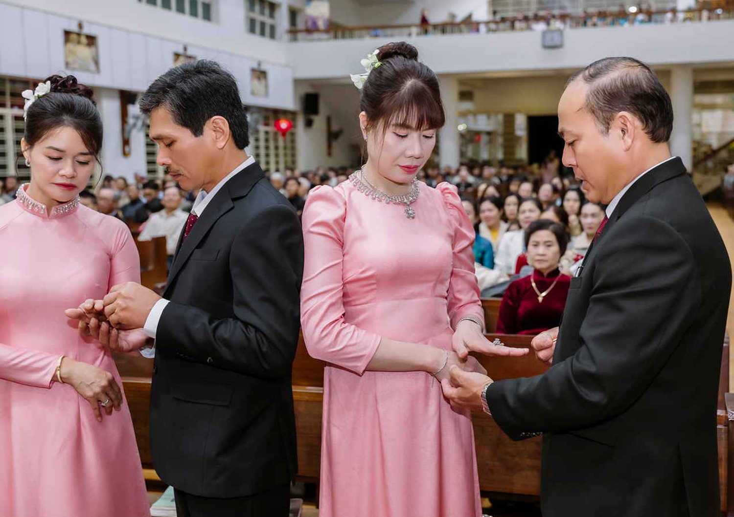 Tiếp đến, các đôi mừng kỷ niệm hôn phối xác nhận lại những lời đã cam kết khi lãnh nhận Bí tích Hôn phối. Sau đó, Cha Quản xứ chủ sự nghi thức làm phép nhẫn cưới và các đôi hôn phối lần lượt trao nhẫn cho nhau.