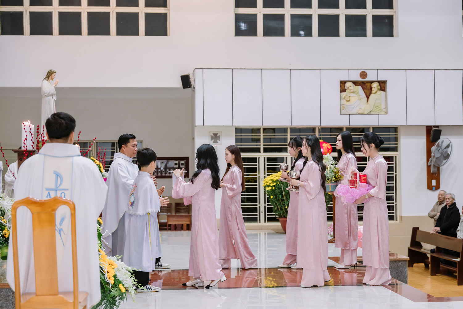 Sau đó, cha Quản xứ trao những món quà lưu niệm ý nghĩa, chúc mừng các gia đình đã trở nên chứng nhân sống động cho tình yêu Kitô giáo. Để thể hiện tấm lòng biết ơn và kính mền, con cái cũng lần lượt gởi đến Ba mẹ những bó hoa thắm đượm chất chứa tâm tình tri ân.