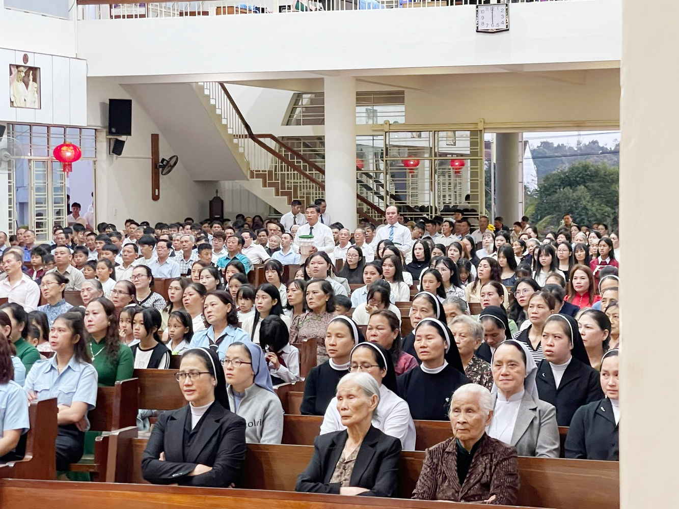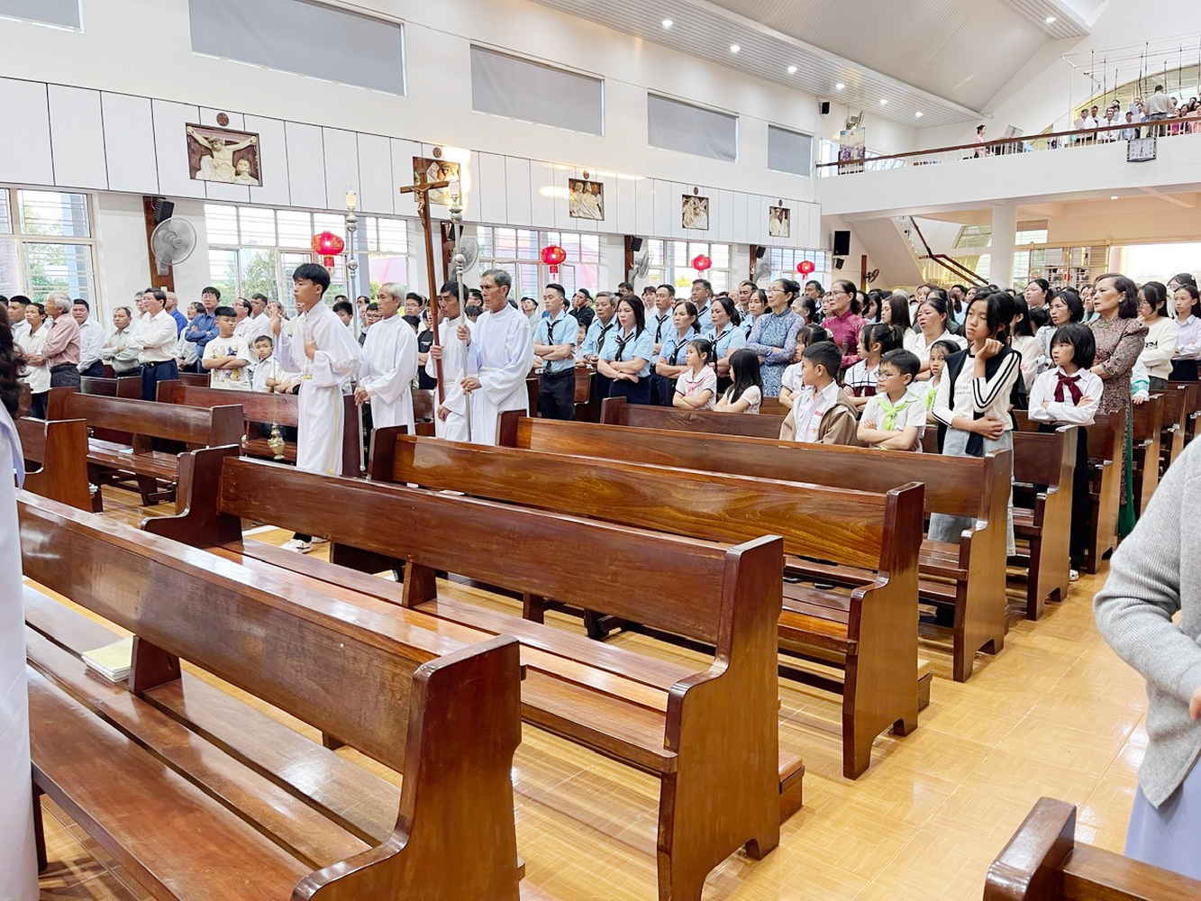 Khi đất trời bước vào tiết xuân, cây cối đâm chồi nảy lộc, lòng người cũng rộn ràng khép lại những lo toan bộn bề của năm cũ để chuẩn bị đón Tết. Vào lúc 17 giờ 30 chiều cuối năm Ất Tỵ, đông đảo cộng đoàn đã quy tụ về ngôi Thánh đường thân yêu, hiệp cùng Cha Quản xứ GB. Trần Vinh và quý Cha quê hương đồng tế. Cùng với sự hiện diện của quý Thầy, quý Sơ, cộng đoàn sốt sắng hiệp dâng Thánh lễ Tất niên, tạ ơn Thiên Chúa vì muôn hồng ân Ngài đã tuôn đổ trên mỗi người, mỗi gia đình và toàn thể giáo xứ trong suốt một năm qua.