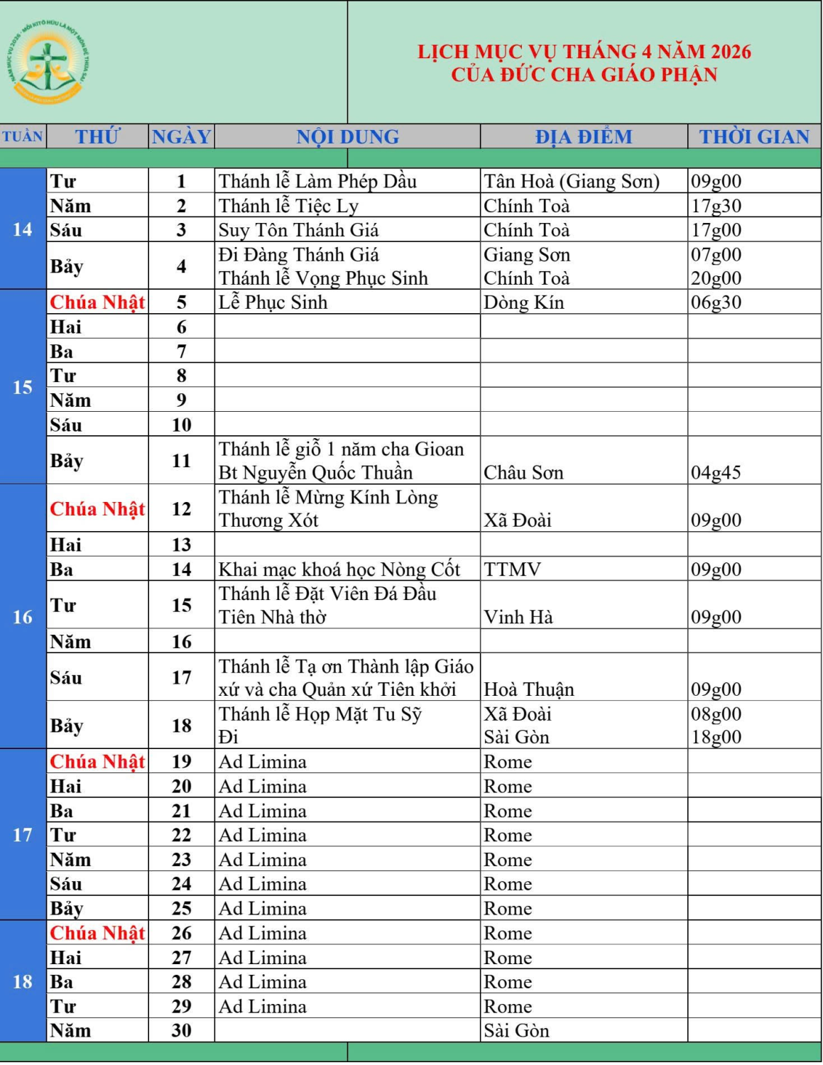 LỊCH MỤC VỤ THÁNG 4 NĂM 2026 CỦA ĐỨC CHA GIÁO PHẬN